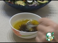 Для заправки соединим все ингредиенты: масло, уксус, соевый соус и мед, посолим, поперчим по вкусу, хорошо перемешаем. Поливаем салат заправкой, перемешиваем и подаем к столу. Салат готовим непосредственно перед подачей на стол, если приготовить его зараннее, он потечет. Можно подготовить все ингредиенты, а потом соединить Приятного аппетита и с наступающим Новым Годом!