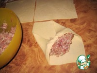 Тесто раскатать очень тонко (1 мм). Нарезать на квадраты 10*10 см. На угол квадрата положить 1 ст. л. начинки. Завернуть как голубцы или долму. |
