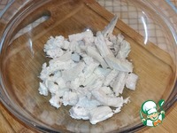 Куриное филе нарезать небольшими длинными кусочками. Высыпать в миску. |