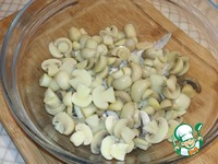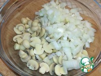 Шампиньоны разрезать пополам и добавить в миску к курице. |