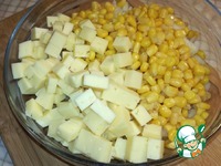 Сыр нарезать средними кубиками. Высыпать в миску. |