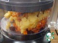 Далее режем кубиком морковь и картофель. Комбайн делает приготовление подобного салата молниеносным. |