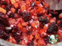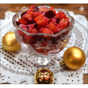 Описание: Да, я к вам с банальным винегретом! Не знаю для кого как, а для меня винегрет в детстве был обязательным салатом на Новый год, вместе с "Оливье", уже позже добавились "Мимоза" и крабовый, был стандартный набор. Сейчас отношусь к винегрету более буднично и меня часто выручает именно этот вариант салата с минимальным количеством ингредиентов. И уверяю вас, что на новогоднем столе он тоже будет пользоваться успехом и если его не украсит, то дополнит однозначно. Тем более, что и после нового года что-то нужно есть, так почему бы нам не сделать салат, который и в пир, и в мир, и как гарнир? Именно этого варианта на сайте нет, потому что это МОЙ вариант, рожденный лично мной в суровых условиях жизни, вдалеке от неосновных продуктов питания)))
