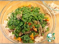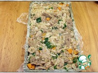 Берём форму для кекса (у меня 23*13*7), застилаем пищевой плёнкой так, чтобы края свисали, на дно выкладываем шкурку и начинаем заполнять начинкой утрамбовывая ложкой. |