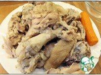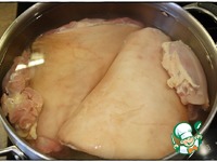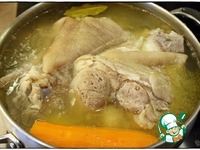 Первым делом моем рульку, заливаем холодной водой, кладём мясо кролика или курицы, две ложки соли. Накрываем крышкой, доводим до кипения и на малом огне варим два часа. |
