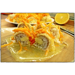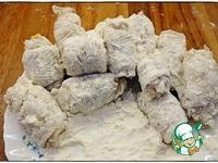 Каждый рулетик обваливаем в муке и лишнее стряхиваем. Отправляем рулетики на раскалённую сковороду с растительным маслом и обжариваем со всех, четырёх сторон секунд по 30, запечатывая рыбу. |