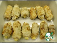 Затем каждую филешку присаливаем, кладём брусочек сыра и сворачиваем рулетиком. |