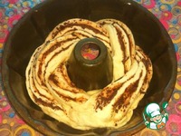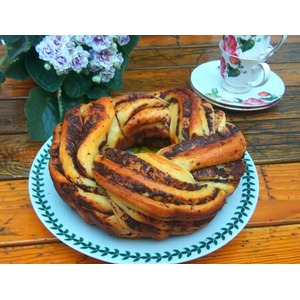 Сформировать венок, поместить в форму с выемкой в центре. Оставить подходить на 15 минут. По желанию смазать верх яйцом. Выпекать при 180 градусах 30 минут. |