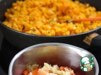 Сладкий перец очистить от семян. нарезать на кусочки. Добавить мелконарезаный чеснок, пару чайных ложек воды Протушить в сотейнике на среднем огне минуты 3-4 |