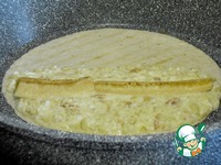 Сковороду разогреть без масла на среднем огне, лепешку тортилью положить на дно. На половину лепешки выложить шестую часть яблочной массы. Вдоль выложить ягоды и накрыть крышкой, |
