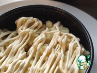В сервировочное кольцо на тарелку выкладываем первый слой сельдь, и отжатый замаринованный лук, я этот слой майонезом не промазываю, кто любит может и этот слой промазать майонезом. |