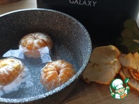 Три мандарина, очистить от шкурки, залить водой, и поставить вариться. Вес очищенных мандаринов, должен быть примерно 200 гр. |