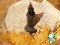 В чашу кухонного комбайна (насадка - нож) положить тертый сыр, масло, муку, соль и перец. |