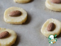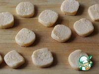Духовку разогреть до 180°С. Противень застелить пергаментом. Достать тесто из холодильника и нарезать его на кружки толщиной 0,5 см. Разложить их на противне. |