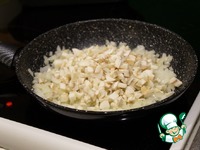 Репчатый лук нарежьте мелким кубиком, слегка пассеруйте на растительном масле. Добавьте порезанные кубиком грибы (несколько штук отложите в сторону), немного обжарьте. |
