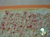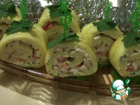 Смазать яичный корж соусом, поверх распределить крабовые палочки, нарезанные кубиком. Свернуть в рулет. |