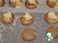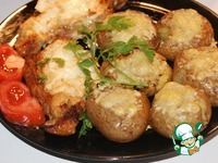 Гарнир: Некрупный картофель отварить в мундире. Поместить на противень, застеленный пекарской бумагой, и слегка раздавить. |