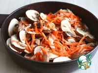 Овожи и грибы спассеровать до легкой румяной корочки. Далее овощную смесь выложить в миску. |