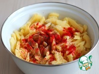 Добавить в картофельную соломку сладкую паприку (1 ст. ложка), соль и черный молотый перец добавить по вкусу, добавить 1-2 ст. ложки растительного масла. Картофель перемешать. |