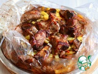 Скрепить рукав клипсами и поместить в форму для запекания. Вверху сделать несколько проколов для выхода пара. Далее форму отправить в разогретую до 190-200*С духовку. Запекать блюдо до готовности. |