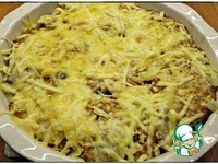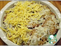 Когда заполнил форму, то не удержался и всё таки сверху натёр сыр. Затем отправил в духовку, нагретую до двухсот градусов на пятнадцать минут. |