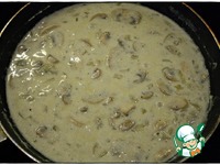 Приступаем к соусу. Растапливаем сливочное масло, добавляем мелко нарезанный лук и пассеруем около двух минут. Добавляем грибы, солим-перчим, перемешиваем, тушим пять минут. |