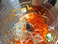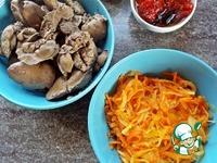 Овощи обжарить на масле. Печень отварить до готовности. |