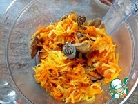 Сложить овощи и печень в чашу комбайна, добавить соль и перец. |