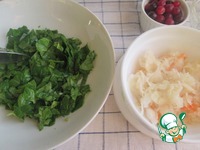 Шпинат вымыть, обсушить и крупно нарезать. Достать из банки квашеную капусту, достаточно взять 3 ст. л. с горкой. |