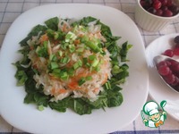 На блюдо поместить нарезанный шпинат и на него - квашеную капусту. Приправить растительным маслом (1-2 ст. л.) и добавить нарезанный зелёный лук. |