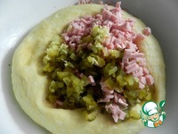 Колбасу, огурцы и чеснок, измельченный на мелкой терке, добавить в подошедшее тесто и присыпая понемногу мукой замесить тесто уже с нашими добавками (понадобится примерно 2 ст. л. муки). |