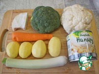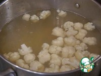 В кипящий бульон заложить картофель, довести до кипения и варить на маленьком огне 5 минут. Добавить цветную капусту и варить еще 5 минут. |