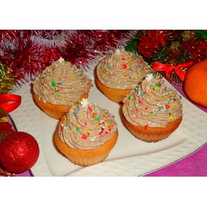 Кексы украсить кремом, применяя кулинарный шприц. Присыпать кондитерскими украшениями. Поставить десерт на 2 часа в холодильник. |