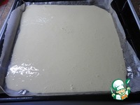 Частями введите к яйцам смесь муки и разрыхлителя, продолжая взбивать. Вылейте тесто на противень и разровняйте. |