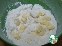 Смешать муку, соль, сахар. Добавить кусочки холодного масла и растереть руками в однородную крошку. |