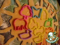 Раскатываем тесто толщиной 5-7 мм и вместе с детьми вырезаем фигурки всем что подвернется под руку, я взяла у дочки формочки от пластилина :)