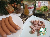 Режем на небольшие кусочки сосиски. Они должны быть подкопчённые. У меня "Баварские" с сыром. Но не буду называть производителя, так как на нашей кухне сегодня царит ТМ ЕКО. |