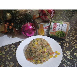 После того, как вода чуть выкипит - её уже почти не будет над рисом, насыпаем сверху горошек и кукурузу ТМ ЕКО. |