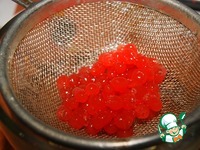С помощью пипетки отсадить капли в холодное масло (водку). Работать нужно быстро, так как смесь сока и агар-агара быстро застывает. Если застыла, то ее можно подогреть (небольшими порциями) в СВЧ. |