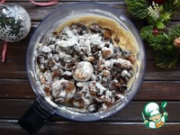 Сухофрукты выложить на бумажное полотенце и немного их подсушить, обсыпать их мукой и добавить в тесто. Перемешать |