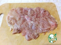 С окорочков вырезать косточку, оставив мясо на шкурке. Слегка посолить, поперчить, отбить через пленку гладкой стороной молоточка или скалкой. |