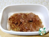 Сложить мясо в контейнер, полить на каждый кусочек по чайной ложке соевого соуса. Накрыть и в холодильник, на 20-30 минут, но можно хоть и на ночь. |