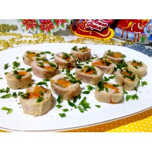 При подаче нарезать по 2-3 см толщиной и разложить на блюдо, посыпать любой зеленью. Вкусно и в теплом, и холодном виде. Приятного аппетита и всех с Наступающим Новым Годом! |