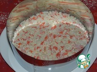 Плавленный сырок натереть на терке, смешать с майонезом (1 ст. л.). Выложить сверху на крабовые палочки. |