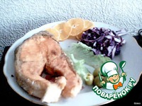 При подаче укладываем рыбку добавляем гарнир (мелко резанную красную капусту, лимончик и капусту и рыбку поливаем нашим соусом. Приятного аппетита.