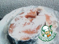 Порционный кусок семги(не мороженой) чуть присолить и по перчить. Обвалять в обычной муке и обжарить до румяной корочки.