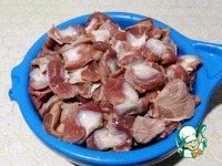 Куриные желудочки хорошо промыть, убрать все жировые пленочки. Замочить в воде с добавлением уксуса на час ( на 1 л воды 1 ст. л.). Промыть, сложить в кастрюлю для варки. |