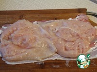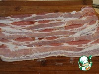 Описание: Этот рулет из птицы приготовлен на манер итальянской поркетты, которую традиционно готовят из свинины. Хотите побольше рулета, возьмите грудку индейки; поменьше - куриная подойдет! Роль "корочки" здесь будет выполнять бекон, покрывающий рулет. Однозначно, этот рулет может стать украшением праздничного стола. И, в то же время, в холодном виде подойдет в качестве закуски. Соус Песто делает разрез очень привлекательным и вкусным!