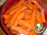 Морковь очистить и нарезать толстыми палочками. Я повыбирала тоненькую морковь, мне не пришлось ее даже резать. Залить ее кипятком на 3 минуты, затем воду слить. |