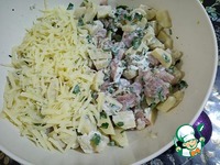 Добавляем тёртый на крупной тёрке сыр и снова перемешиваем. |